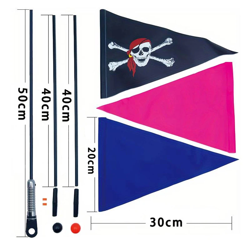Cet ensemble de drapeaux de sécurité pour vélo est composé de 3 fanions interchangeables, une patte de fixation avec ressort en acier chromé et 3 mâts en fibre de verre assurant une hauteur de 130 cm et 2 boules protège drapeau.