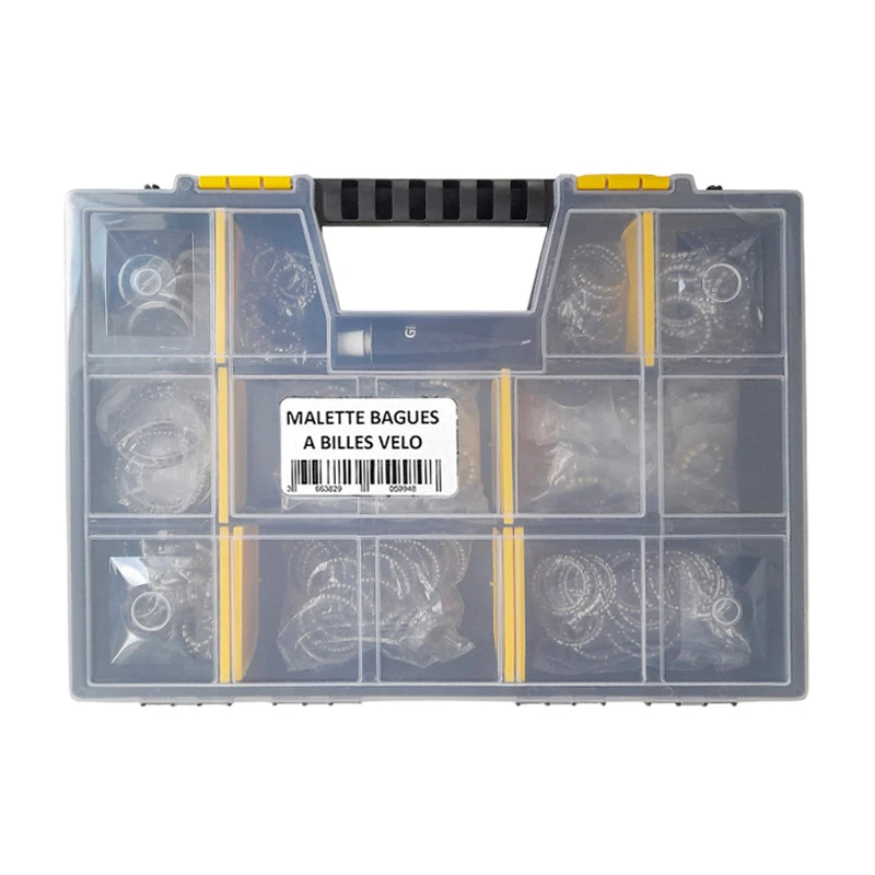 Cette mallette avec poignée et séparateurs de rangement, destinée aux particuliers, passionnés, entreprises et ateliers de réparation de vélos, contient un tube de graisse verte et 155 cages à billes.