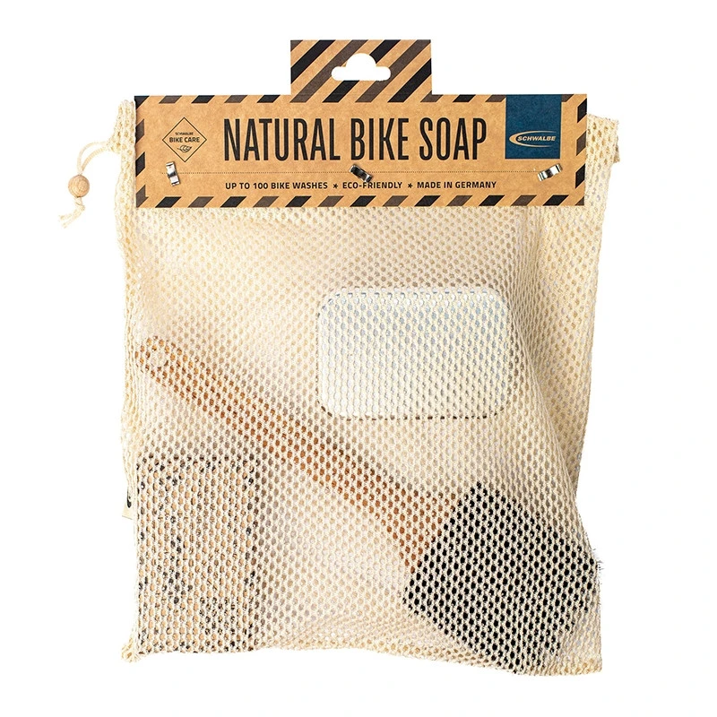 Le Bike Soap de Schwalbe entièrement composé selon des critères de durabilité est livré dans une boîte en fer recyclable pour le stockage avec une brosse en crin de cheval bio pour le moussage et le nettoyage ainsi qu’un savon 100% biodégradable. L’emballage du kit se compose d’un sac en filet réutilisable en fibres de bois, compostable après son cycle de vie.