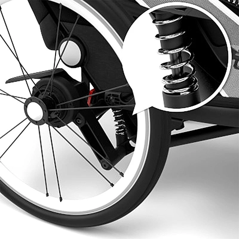 Encore plus de confort avec des roues arrières gonflés à l’air et équipés d’amortisseur pour que l’enfant se sentent berçés lors des sorties avec ses parents.