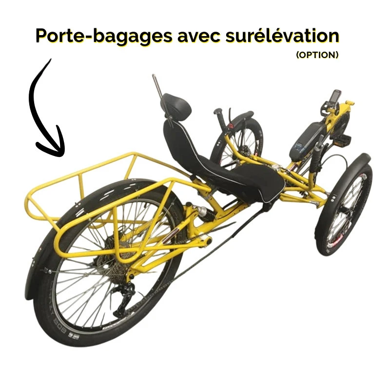 Le tricycle couché est équipé d’un fanion de sécurité, garde-boues avant et arrière ainsi qu’un porte-bagage permettant d’installer des sacoches suspendues afin de transporter vos affaires personnelles. Une version de porte-bagages surélevée est disponible en option.